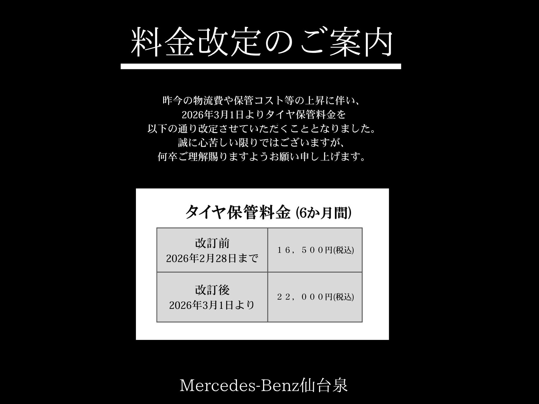 昨今の物流費や保管コスト等の上昇に伴い、2026年3月1日よりタイヤ保管料金を以下のとおり改定させていただくこととなりました。