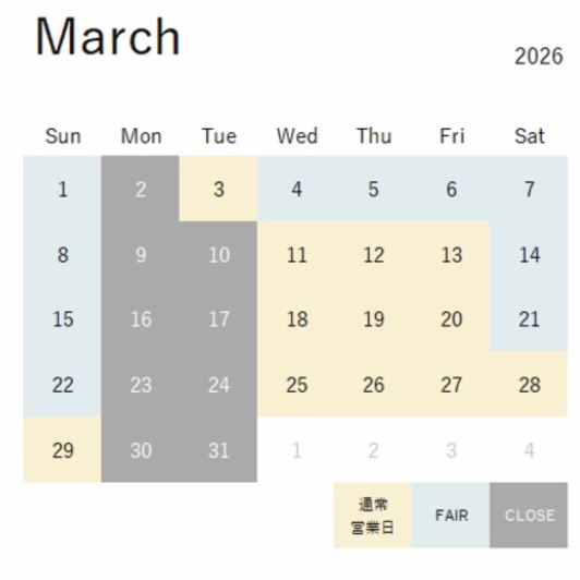 ※28日(日)~31日(水)は、誠に勝手ながら年末年始休業とさせていただきます。また、年始は1月6日(火)より通常営業とさせていただきます。