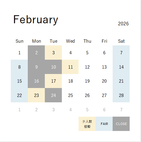 さて、2月の営業ですが、2月11日(水)祝日は当番体制の営業となります。