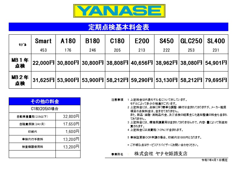 点検整備に係る作業料金表になります。